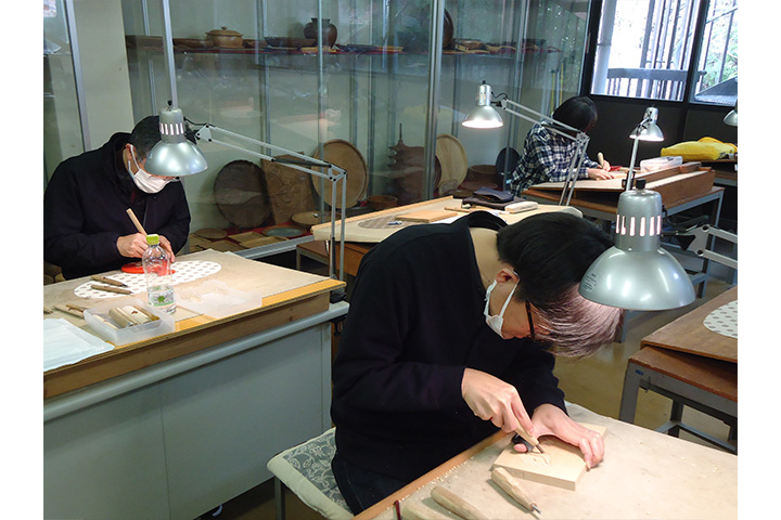宮島彫りの後継者育成事業は、経済産業大臣賞などの受賞歴がある伝統工芸士で組合理事長も務めた広川和男さんが21年に亡くなり中断していたが、22年5月に再開。広川さんの弟子で、24年に伝統工芸士に認定された大野浩(39)、沖田要(43)両氏が講師を務める。2人も組合に作品を卸し、島内の土産物店などで販売。大野さんは「宮島彫りは木材の素地を生かした彫刻で、木製の茶道具や盆などに筋彫りのほか沈め彫り、浮かし彫りなどで立体的に彫刻を施す。伝統工芸士は同じく広川さんの弟子の永谷早登さんと計3人で、宮島小学校の体験学習など普及活動も行っている」と話す。