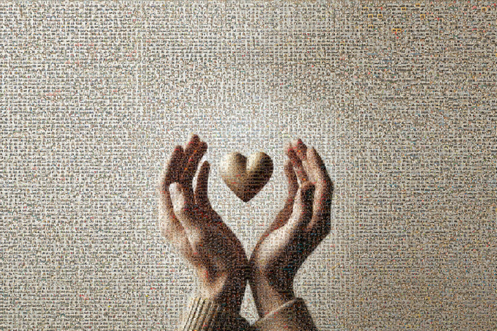 昨年の創業90周年を機に企画した。運営する写真スタジオ全店で年間を通じて希望者を募り、無償で撮影と写真データを提供。全員が笑っている写真を選び、二つの手がハートを包み込む絵に仕上げた。デザインは「家族の愛」をテーマに生成AIが作った。