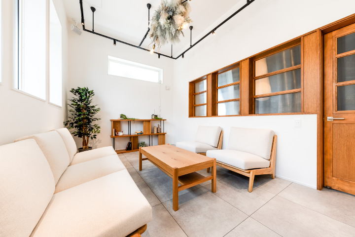 事業拡大に伴い、2階建て延べ360平方㍍の本社屋が手狭になっていた。「プロパティマネジメント支店」と名付け、本社から北側に徒歩1分ほどの同2―12―24の敷地440平方㍍に2階建て延べ296平方㍍を新築。オーナーとの打ち合わせや会議に使うスペースを四つ設け、カフェ風などそれぞれ異なるデザインに仕上げた。高齢のオーナーにも気軽に来店してもらえるよう、シミュレーションゴルフスペースも備える。2階の事務所は自席を定めないフリーアドレス制にし、コミュニケーションが取りやすい環境を整えた。