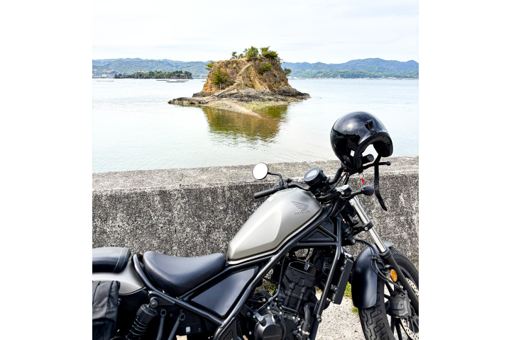 こうした活動から良い意味で、仕事でめまぐるしい日々に追われていますが、時間ができた際にはツーリングで気分転換。時々バイクをまたいでいたものの、数年前にホンダの中型バイク「レブル250」を購入してからはライド頻度が増えましたね。バイクは車とは違い車体に囲まれた空間ではなく、爽快な風と共に走れるためこうした開放感がたまらなく、また見慣れた街の風景がなぜか違って見えるのが不思議。山口の実家は海が見えない場所だったので幼い頃から海に憧れがあり、思い返せば無意識に潮の香る場所へ向かうことが多いかもしれません。今年のゴールデンウイークには東広島市安芸津町風早の大芝島の近くにある小さな島(=写真=)へ。フランスの世界遺産「モンサンミシェル」を思わせることから「大芝島のモンサンミシェル」と言われているそうです。その様子をSNSにアップし、知人からお薦めのロードや目的地を紹介してもらうこともあります。